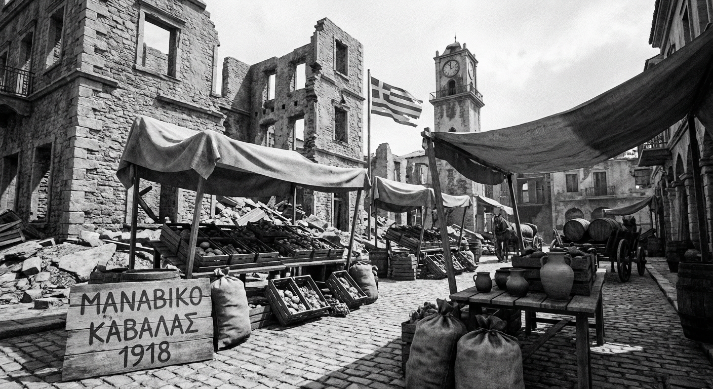 Μια σπάνια χρονογραφική απεικόνιση, που αιχμαλωτίζει την ψυχή μιας εποχής, μας μεταφέρει στα στενά της Καβάλας του 1918. Σε ένα ταπεινό μανάβικο, εκεί όπου η καθημερινότητα έδινε τον δικό της αγώνα για να επικρατήσει, ένας φωτογράφος αποτύπωσε μια σκηνή που έχει ξεχαστεί από τα επίσημα χρονικά. Η πόλη, ακόμα φορτωμένη με τα τραύματα παλαιότερων συγκρούσεων και τις αναταραχές που ακολούθησαν, επιχειρούσε να ξαναβρεί τους ρυθμούς της. Η επιλογή ενός τέτοιου χώρου, ενός απλού μανάτικου, δεν είναι τυχαία. Αντιθέτως, μας δίνει μια άμεση και ανεπιτήδευτη εικόνα της προσπάθειας για ανάκαμψη, της επιμονής στην επιβίωση και της αναζήτησης μιας αίσθησης κανονικότητας, παρά τις δυσμενείς συνθήκες. Η ίδια η ύπαρξη και η λειτουργία ενός τέτοιου καταστήματος, την εποχή εκείνη, στέλνει ένα ισχυρό μήνυμα ανθεκτικότητας.