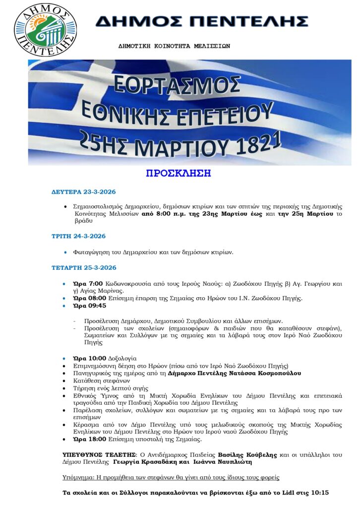 Οι εορταστικές εκδηλώσεις ξεκινούν με την τέλεση θρησκευτικών μνημοσύνων και πανηγυρικών διαλέξεων, οι οποίες θα φωτίσουν την πνευματική και ηθική διάσταση της Επανάστασης, αναδεικνύοντας τους ιδεολόγους και τους πνευματικούς ηγέτες πίσω από τον αγώνα. Παράλληλα, θα πραγματοποιηθούν παρελάσεις, με τη συμμετοχή μαθητών, σπουδαστών, ενόπλων δυνάμεων και σωμάτων ασφαλείας, οι οποίοι θα τιμήσουν την ιστορική επέτειο με την παρουσία τους και την επίδειξη εθνικής υπερηφάνειας. Στην ατμόσφαιρα των εορτασμών θα κυριαρχούν η ελληνική σημαία και οι πατριωτικοί ύμνοι, δημιουργώντας ένα κλίμα εθνικής ενότητας και ανάτασης. Οι δράσεις αυτές στοχεύουν στην ουσιαστική σύνδεση των πολιτών με την ιστορική τους κληρονομιά, ενθαρρύνοντας την ενεργό συμμετοχή και την ανάληψη ευθυνών για τη διατήρηση και την πρόοδο της χώρας, βασισμένη στις αρχές που εμψύχωσαν τους ήρωες του 1821.
