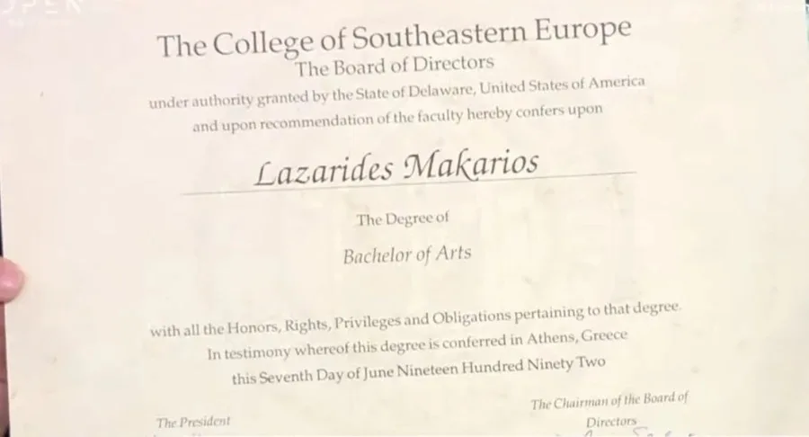 Ο Μακάριος Λαζαρίδης έδειξε το πτυχίο που είχε πάρει το 1992 από το συγκεκριμένο κολλέγιο και είπε: «Το 2007, μπορούσες να εργαστείς ως μετακλητός υπάλληλος ακόμα και με αυτή την βεβαίωση σπουδών παρά το γεγονός ότι δεν ήταν αναγνωρισμένο πτυχίο». Και πρόσθεσε: «Αυτό συνέβαινε γιατί οι μετακλητοί υπάλληλοι διορίζονται με πολιτική επιλογή του υπουργού και του γ.γ. και δεν περνούν από ΑΣΕΠ».