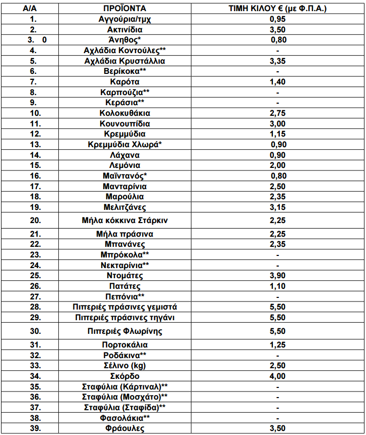 Οι διαμορφωθείσες μέσες λιανικές τιμές στα παρακάτω αναγραφόμενα είδη (ΟΠΩΡΟΚΗΠΕΥΤΙΚΑ) που προσφέρονται στις προμήθειες του Δημοσίου, Νοσηλευτικών Ιδρυμάτων και Ν.Π.Δ.Δ. χωροταξικής αρμοδιότητας της Π.Ε. Γρεβενών έχουν ως εξής: