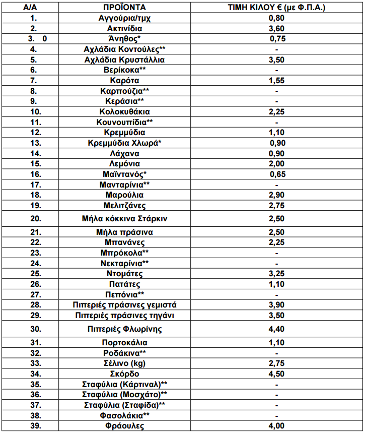 Οι διαμορφωθείσες μέσες λιανικές τιμές στα παρακάτω αναγραφόμενα είδη (ΟΠΩΡΟΚΗΠΕΥΤΙΚΑ) που προσφέρονται στις προμήθειες του Δημοσίου, Νοσηλευτικών Ιδρυμάτων και Ν.Π.Δ.Δ. χωροταξικής αρμοδιότητας της Π.Ε. Γρεβενών έχουν ως εξής: